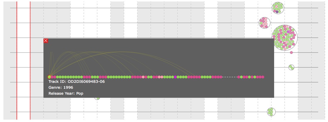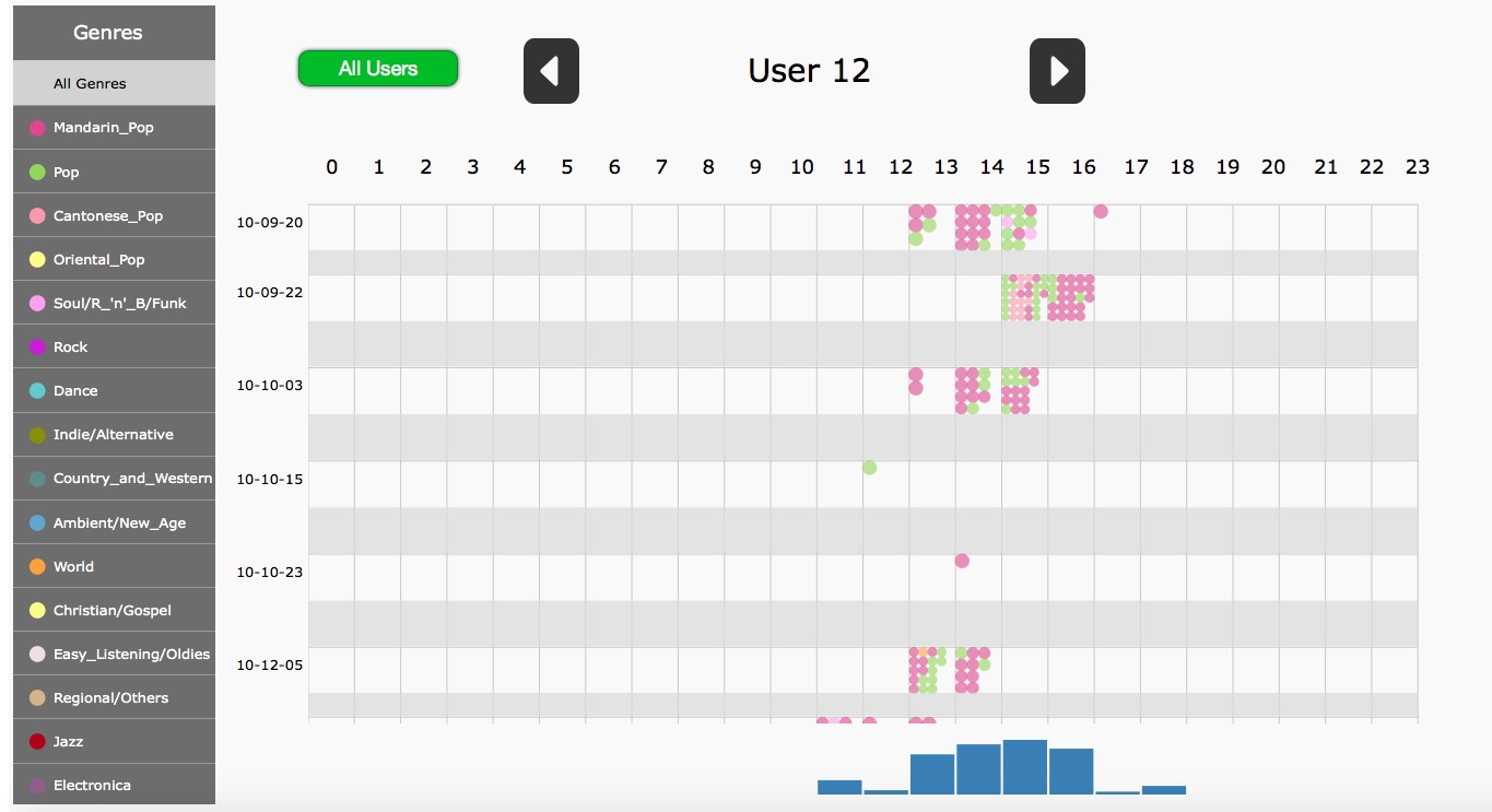 This is the extension of Music Vis project. In Music Vis, we focus on presenting users' interest and its shift. In this project, we pay more attention on the diurnal pattern of user's music listening. We visualize user's listening history by hour in the new visualization. Bean plot is combined into the new visualization to show user's interest in each session. More information such as collaborative relevance among music tracks are presented in interaction with the plot.