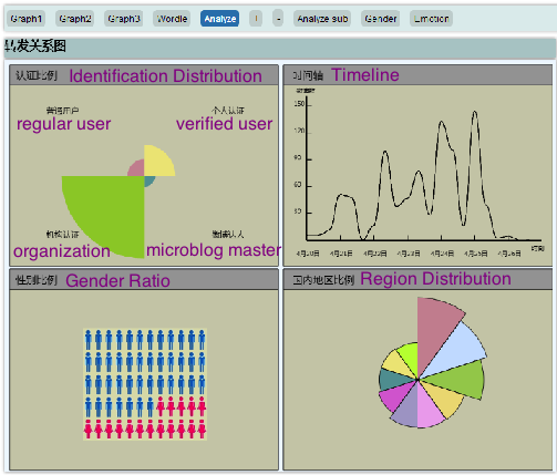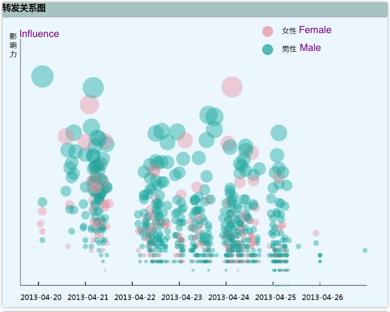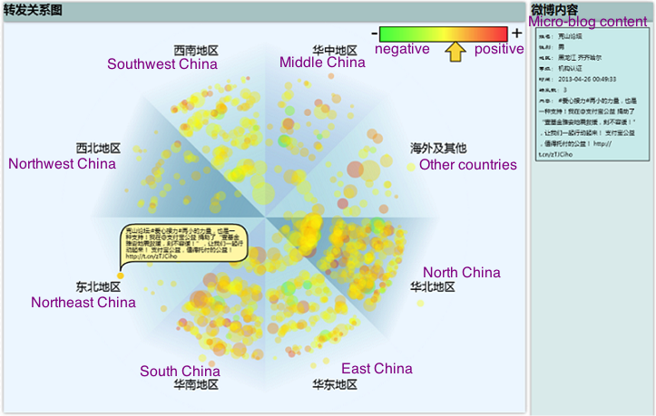 In this project we visualized the propagation of public events in Sina Weibo (microblog). A helical visualization is designed to show the repost process, including repost chain and levels of reposts. We also visualize the relation between users' gender and influence (a combination of follower number, repost number, and comment number), region and sentiment, and gender and sentiment.